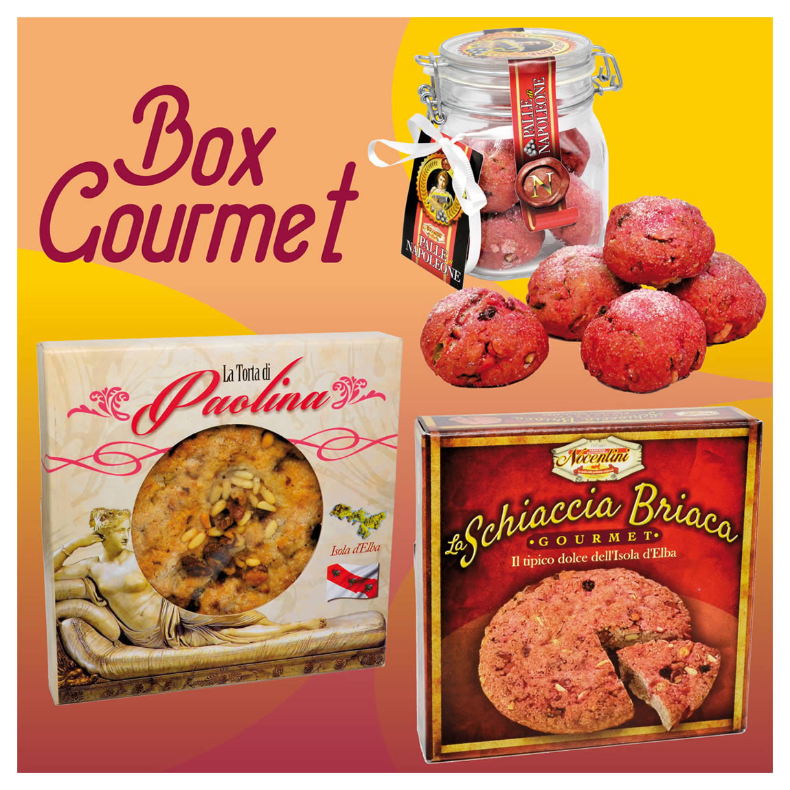 Il Box Gourmet comprende tutti i prodotti della nostra linea Gourmet per gustare in pieno le prelibatezze dell’Isola d’Elba: Palle di Napoleone, Schiaccia Briaca e Schiacciunta.